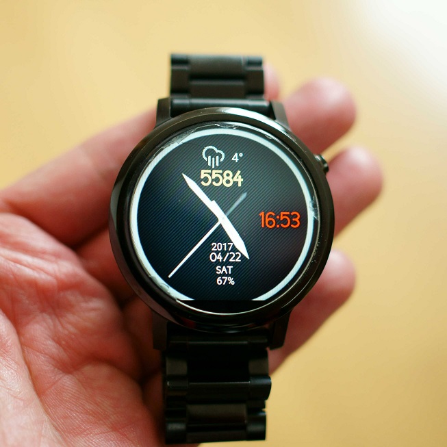 Moto360の美しい液晶表示に見慣れた目では、アナログのあのガラス面はむしろ視認性が悪いくらいでした。うす暗いところで必死に目を凝らして時計を見るとかもうあり得ない。
